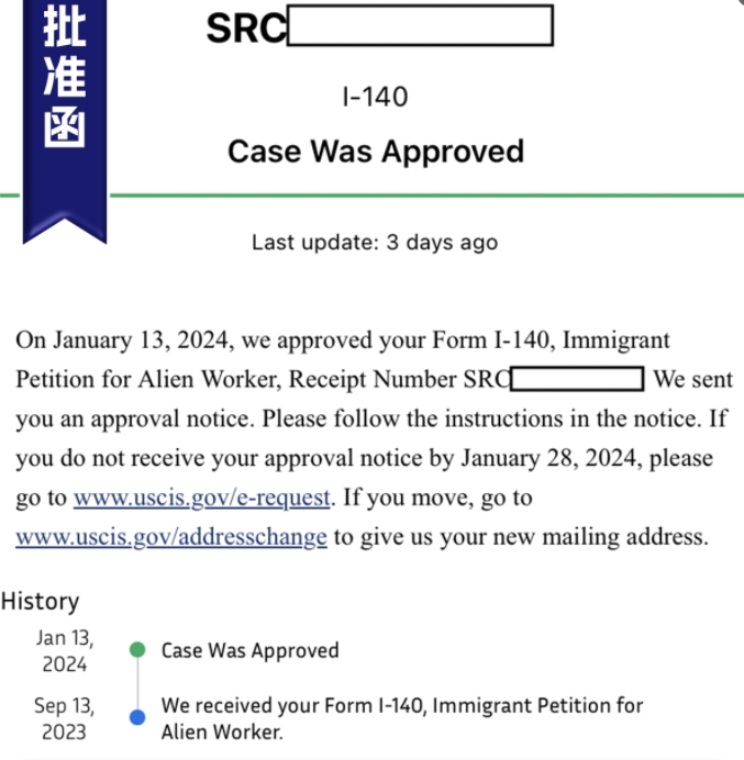 批准通知:陈女士于2024年1月13日收到了批准通知,标志着她的NIW移民申请顺利通过。